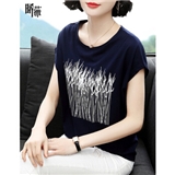 【精选好货】晞薇短袖t恤女2020新款夏装纯棉上衣宽松舒适印花上衣衫半袖小衫中年妈妈女士体桖夏 深蓝色 M