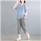 芷依丽 时尚套装女2020夏季新款韩版刺绣宽松大码显瘦减龄短袖T恤女休闲九分哈伦裤两件套 蓝上衣+条纹裤 M