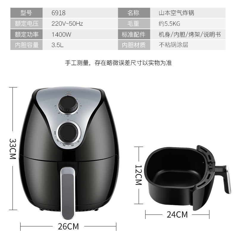 山本空气炸锅家用4.0升大容量炸薯条机【PP/黑色】 |