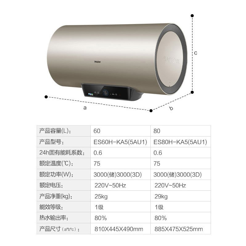 Haier/海尔 ES80H-KA5(5AU1) 3D速热80升6倍增容 智能预约恒温储水式家用 一级能效【不锈钢/金色】 |
