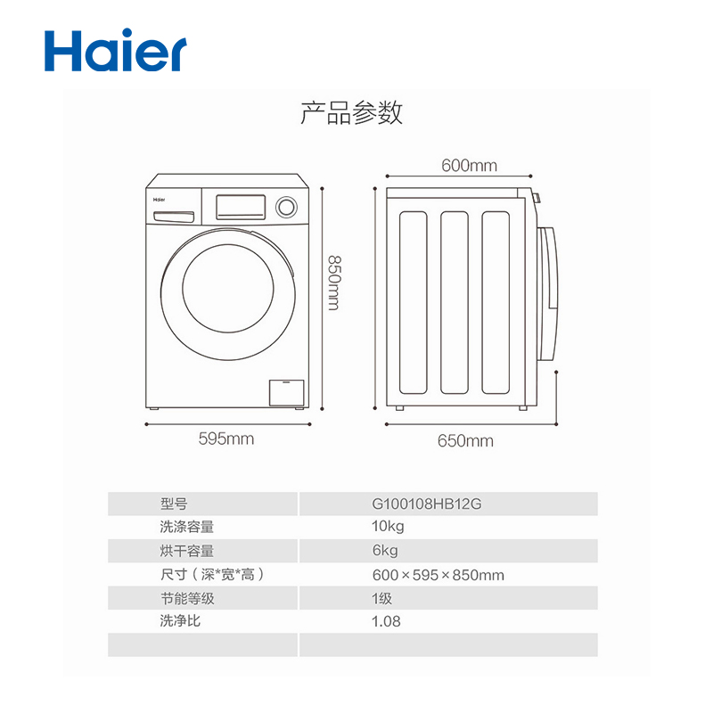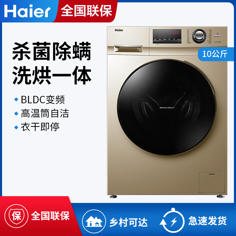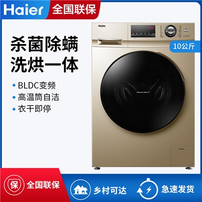 Haier/海尔 G100108HB12G 滚筒洗衣机烘洗干一体机空气洗家用变频除螨10公斤大容量筒自洁【渗锌钢板/金色】 |