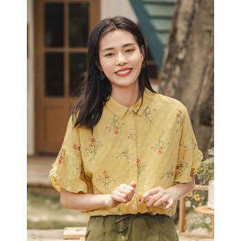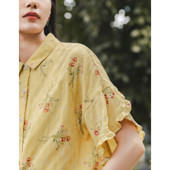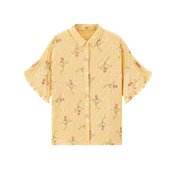 茵曼2020秋装新款素雅印花中袖衬衣翻领宽松显瘦木耳边袖口衬衫女 阳光黄 S |