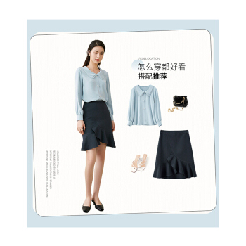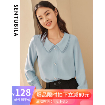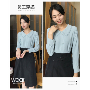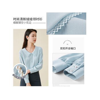 尚都比拉长袖女士衬衫2020秋装新款小花边娃娃领职业风雪纺珍珠扣上衣 浅灰蓝 M |