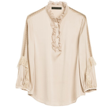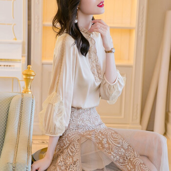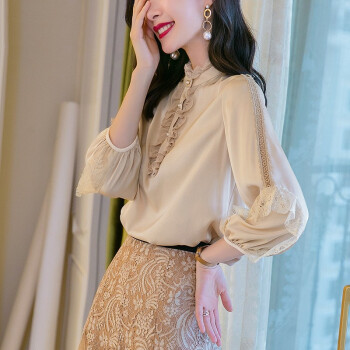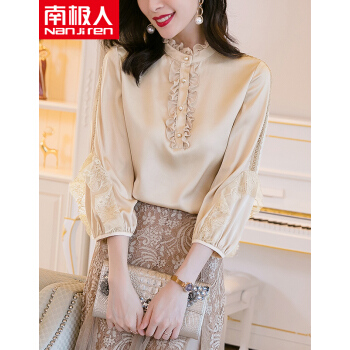 南极人 衬衫女2020夏季新款长袖女装衬衣韩版时尚木耳边立领镂空蕾丝拼接上衣潮 N4-DGB405-6890-香槟色 M |
