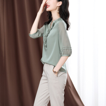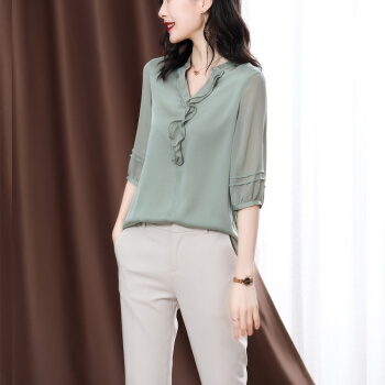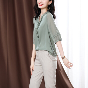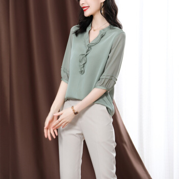 南极人 衬衫女短袖衬衣2020夏季新款女装雪纺小衫韩版时尚气质木耳边V领宽松上衣潮 N4-NRE233-1004-果绿 L |