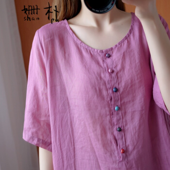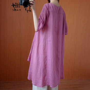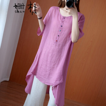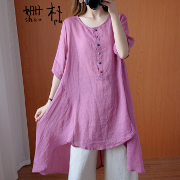 姗朴 棉麻衬衫女民族风2020夏季新款文艺复古大码女装宽松显瘦中长款不规则衬衫裙遮肚减龄衬衣小衫上衣 粉色 大码L【建议130斤以下】 |