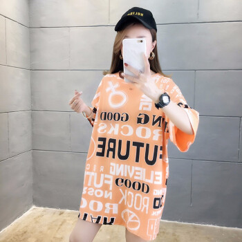 凝拉t恤女短袖纯棉2020新款夏装中长款韩版宽松大码欧货潮上衣服半袖体恤 桔色 2XL(建议150-170斤) |