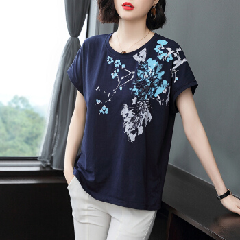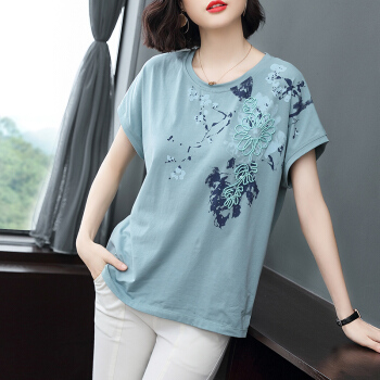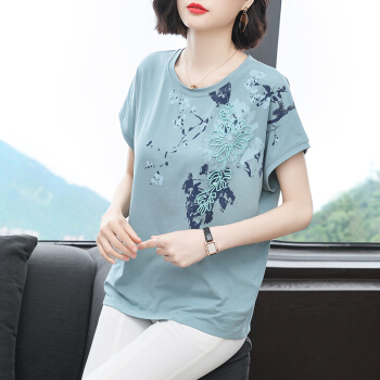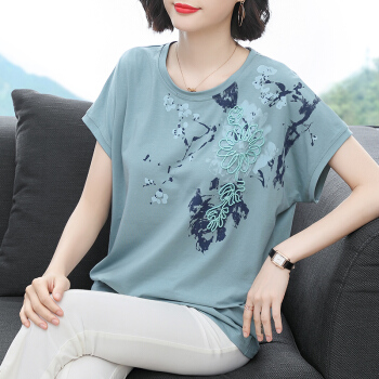 红粉宣言2020夏季新款百搭宽松纯棉短袖T恤女大码碎花中年妈妈装 浅绿色 L |