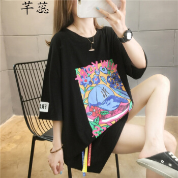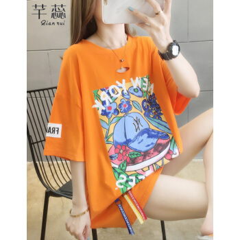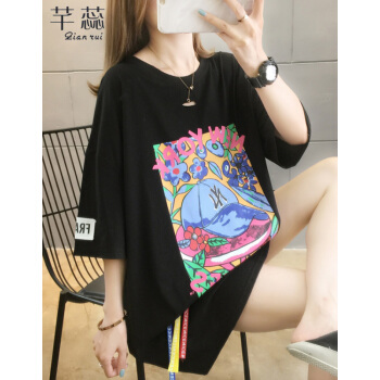 芊蕊短袖t恤女2020新款时尚韩版印花圆领中长款宽松大码女装胖MM半袖打底上衣服ins潮 粉红色 M |