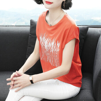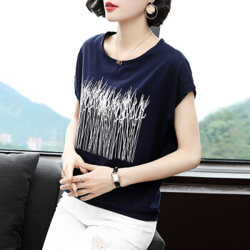 【精选好货】晞薇短袖t恤女2020新款夏装纯棉上衣宽松舒适印花上衣衫半袖小衫中年妈妈女士体桖夏 深蓝色 M |
