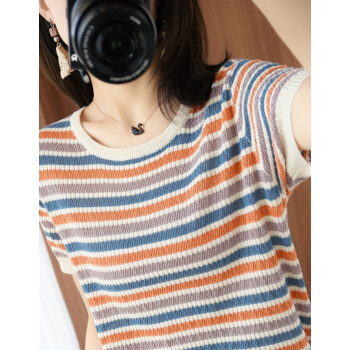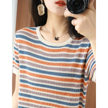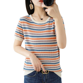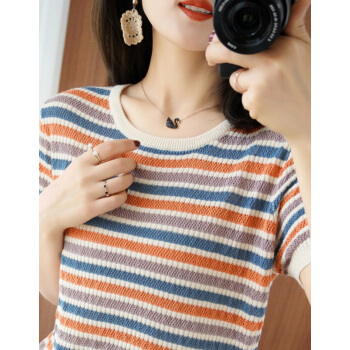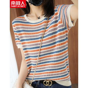 南极人 短袖t恤女装夏季2020年新款气质韩版时尚条纹撞色拼接针织小衫上衣女 条纹 M |