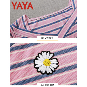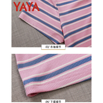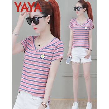 鸭鸭服饰yayaT恤女装夏季新款短袖夏装2020年新款衣服女短款条纹t恤女薄款修身洋气v领上衣 粉条纹 请选择正确尺码 |