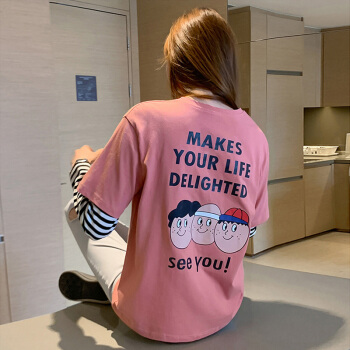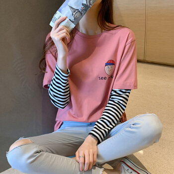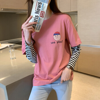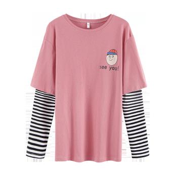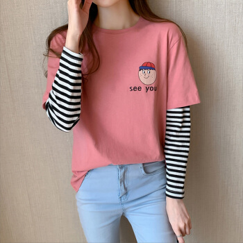 纯棉长袖t恤女2020春秋新款韩版学生百搭宽松上衣打底衫 7059粉 S 65-70斤 |