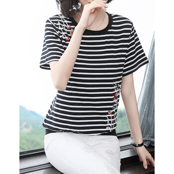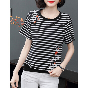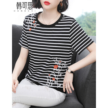 【精选好货】韩可思2020夏装新款女士条纹T恤女短袖韩版时尚宽松半袖百搭绣花上衣棉大码体桖夏 条纹 请拍正确尺码 |