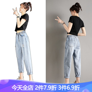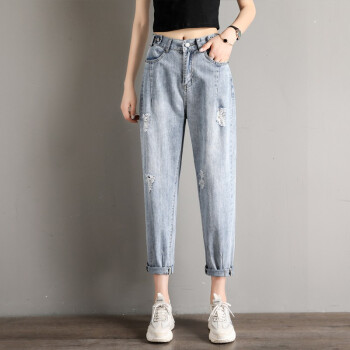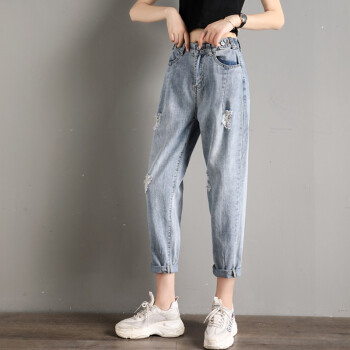 破洞牛仔裤女宽松直筒2020年春夏季新款韩版高腰显瘦百搭老爹裤休闲松紧腰哈伦萝卜裤子 919浅蓝(破洞) M码 |