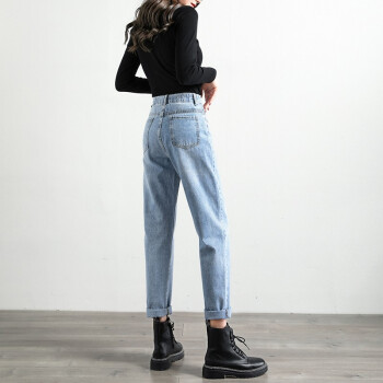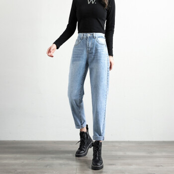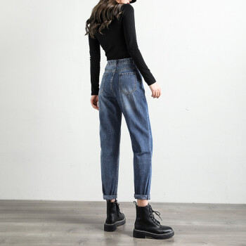 麦潮尚2020秋季新款松紧腰牛仔裤女高腰橡筋老爹裤显瘦哈伦裤子 复古蓝色 XXS建议70斤内 |
