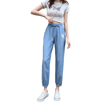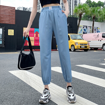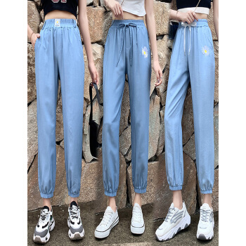 五个橘子牛仔裤女冰丝 2020新款女裤夏薄韩版宽松大码学生小雏菊九分裤女束脚裤高腰天丝休闲哈伦裤垮裤 无抽绳 L |