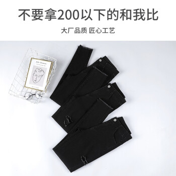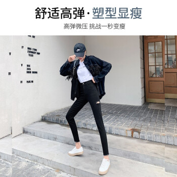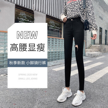 右昀 紧身牛仔裤女裤子夏季薄款2020新款黑色高腰春秋打底裤女外穿修身九分显瘦网红百搭破洞铅笔小脚裤 常规款-黑色 L【适合105-115斤】 |