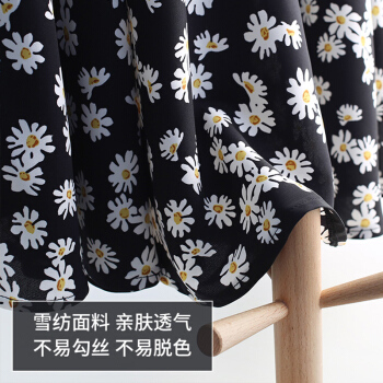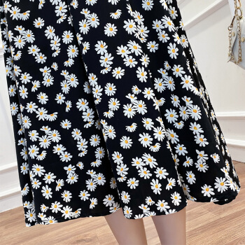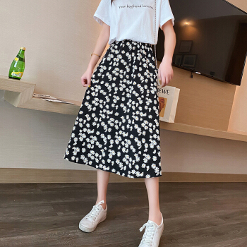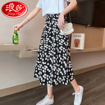 浪莎半身裙女夏季高腰碎花长裙a字中长款黑色显瘦雪纺小雏菊短裙 黑色-半身裙 L(建议85-120斤) |