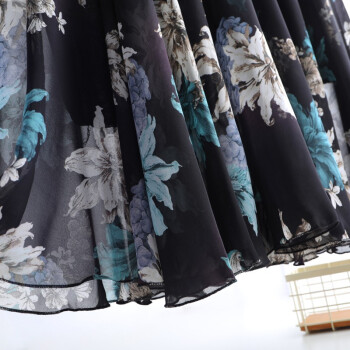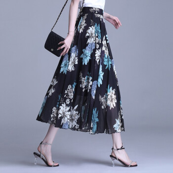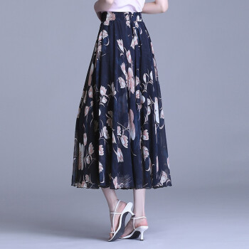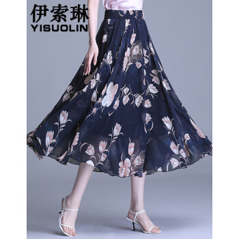 伊索琳碎花裙半身裙中长裙女夏2020新款高腰印花中长款垂感雪纺半身裙 蓝底红花 均码 80-140斤 |