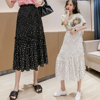 五个橘子半身裙女中长款雪纺裙子2020年新款女装夏季波点裙韩版松紧高腰A字半身裙伞裙蓬蓬裙垂感显瘦 黑色 均码(85-130斤) |