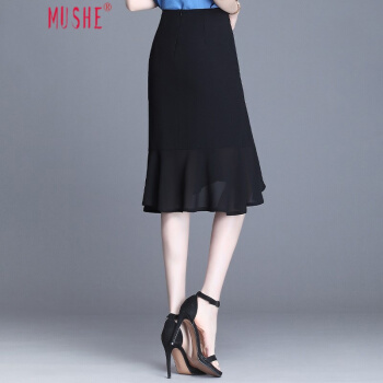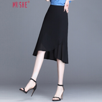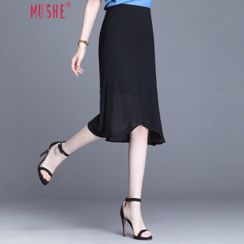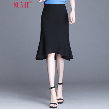MUSHE轻奢原创女装 中长款纯色半身裙女2020夏季新款时尚名媛优雅减龄高腰不规则包臀鱼尾裙 黑色 21/L |