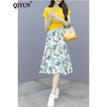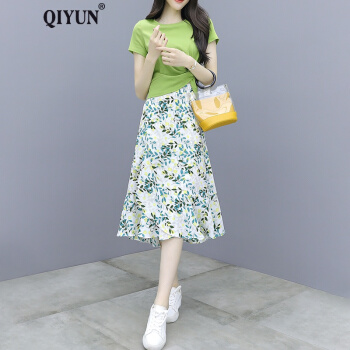 QIYUN品牌女装 时尚套装裙女小个子洋气减龄2020夏装新款女雪纺碎花半身裙两件套 翠绿色 M |