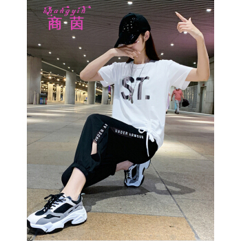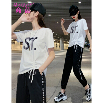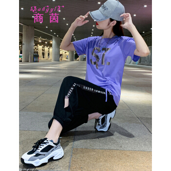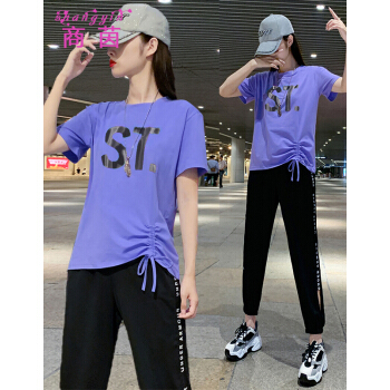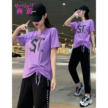 商茵SY休闲运动套装女休闲裤女夏2020新款韩版时尚休闲服纯棉宽松大码显瘦时尚减龄两件套潮 紫色套装 M(建议85-100斤) |