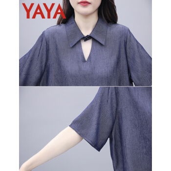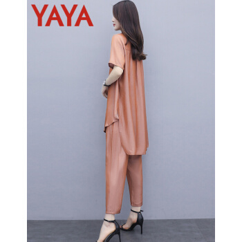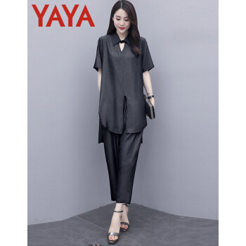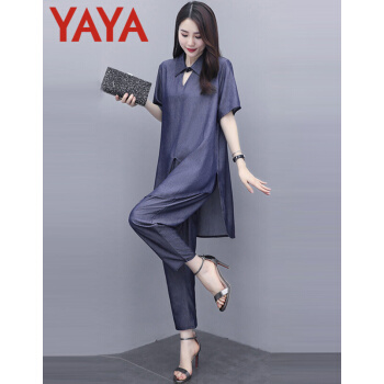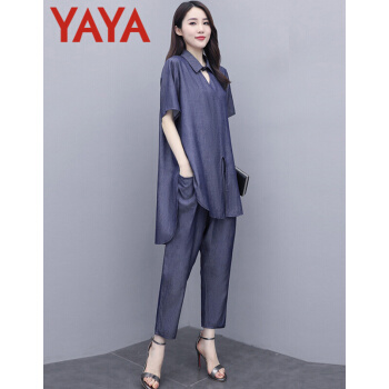 鸭鸭服饰yaya休闲裤女时尚妈妈装两件套2020年女装夏季新款洋气大码宽松中年人成熟套装女 牛仔蓝 请选择正确尺码 |