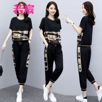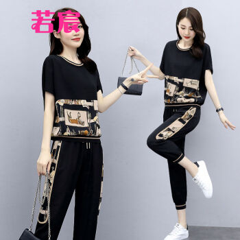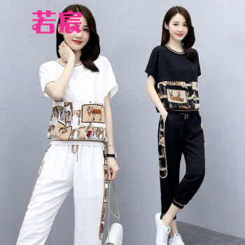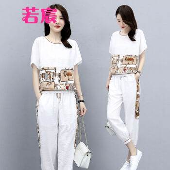 若宸两件套套装女2020夏休闲裤女运动九分时尚束脚裤大码女装冰丝裤子 白色 M |