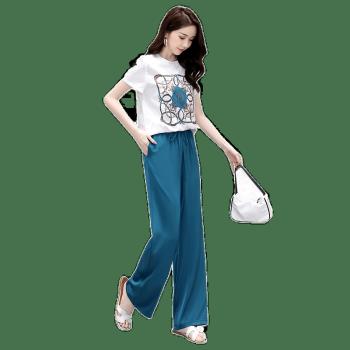信和祥休闲裤女雪纺套装女夏装2020新款气质女神范衣服洋气减龄休闲两件套阔腿裤 蓝色 L |