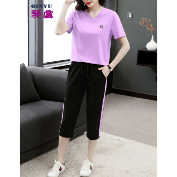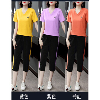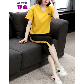 琴虞QY休闲运动套装七分休闲裤套装女夏2020新款大码胖妹妹显瘦套装梨形身材穿搭显瘦遮肉时尚两件套 桔色套装 M【建议85至100斤】 |