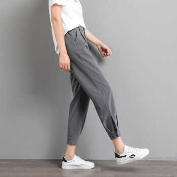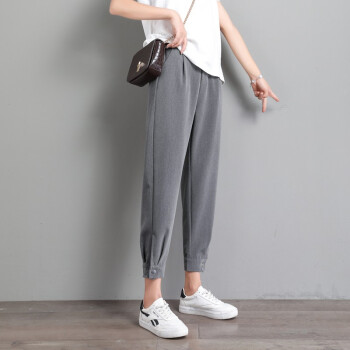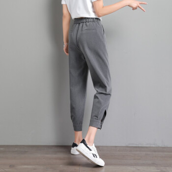 阔恋冰丝休闲裤女夏季薄款束脚西装裤2020新品直筒宽松高腰哈伦裤子百搭显瘦九分裤韩版松紧腰萝卜女裤 灰色 M |