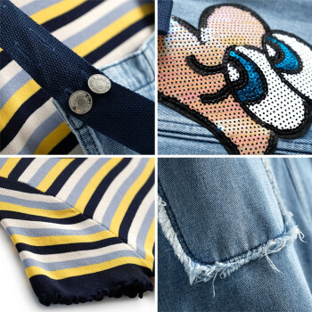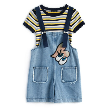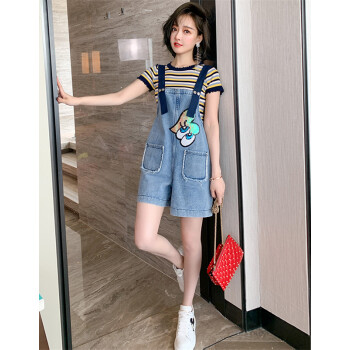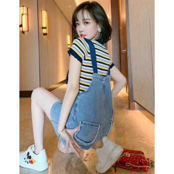 乐佐妮短裤女套装牛仔背带裤2020夏季新款条纹短袖T恤两件套阔腿裤 条纹+牛仔蓝 S |