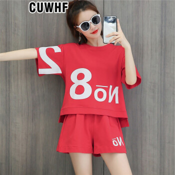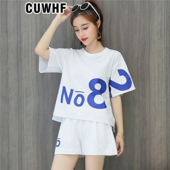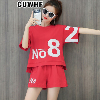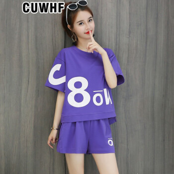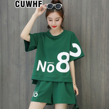 CUWHF 短裤女休闲套装女短裤运动服夏季新款2020时尚胖MM大码短袖T恤两件套潮 绿色 L |