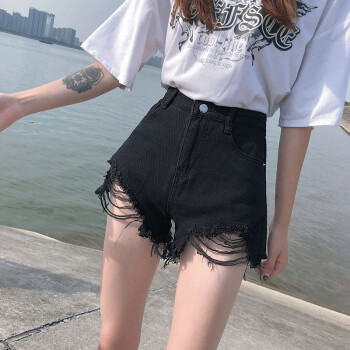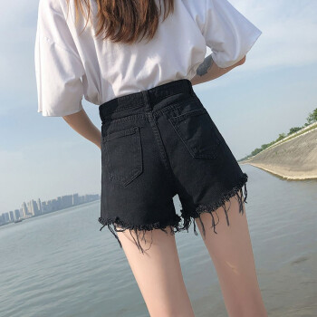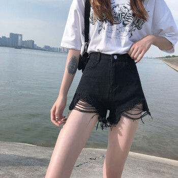 沫澜仟衣黑色破洞牛仔短裤女阔腿宽松高腰显瘦2020夏季薄款潮流时尚加大码胖mma字热裤 黑色 26码 |