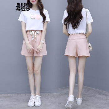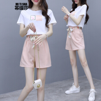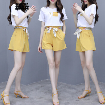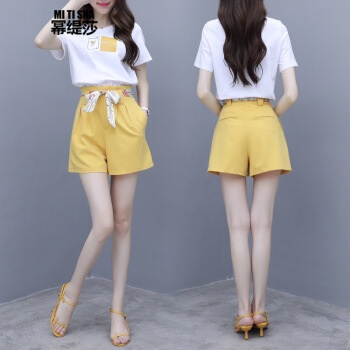幂缇莎短裤女两件套夏坠感阔腿中裤t恤女套装减龄抹茶绿休闲温柔风小个子 黄色 L |