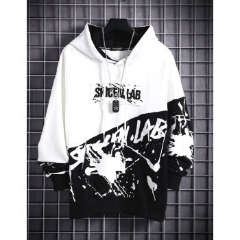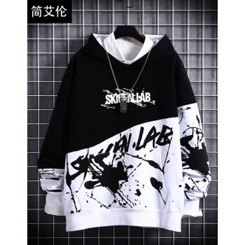 简艾伦 卫衣男连帽2019春秋季新款日系嘻哈潮流圆领加绒加厚长袖t恤男士韩版潮流学生套头宽松潮牌外套 WJX8808上黑下白 上衣【不加绒】 XL |