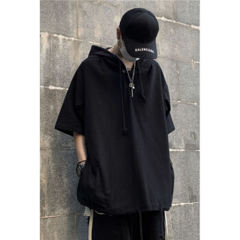卫衣男连帽ins潮牌新品薄款2020夏季时尚短袖T恤男夏装衣服七分潮流五分半袖男士外套体恤男装 黑色 XXS |