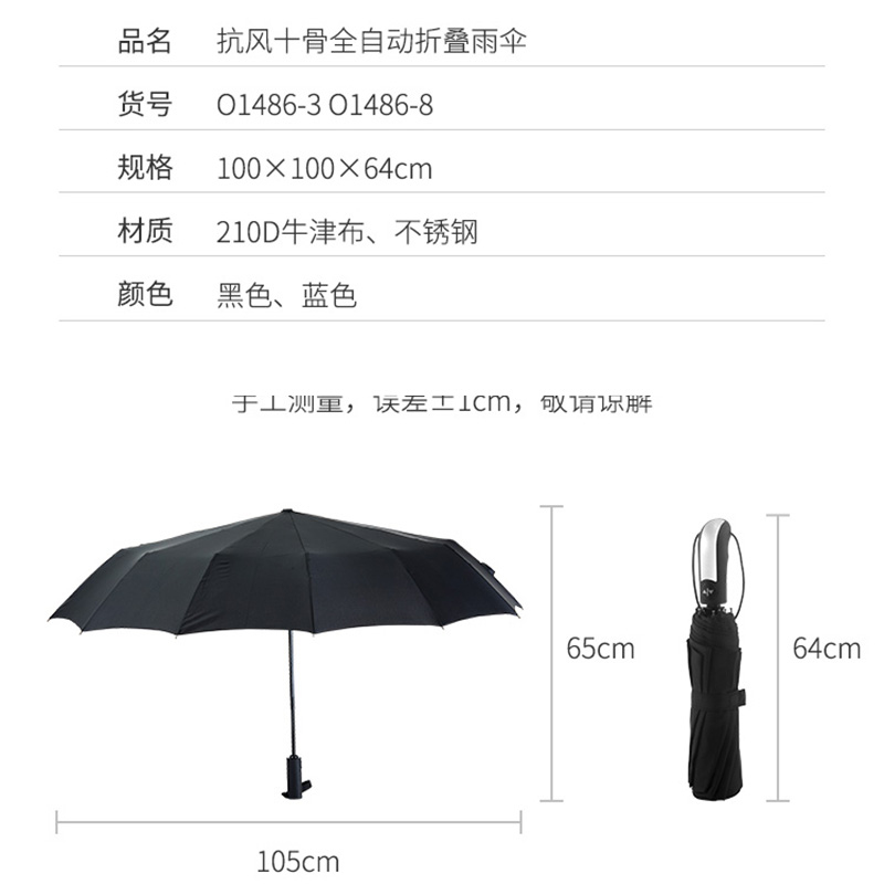 强效抗风超大十骨全自动折叠晴雨伞太阳伞遮阳伞【210D牛津布 不锈钢/颜色自选】 |