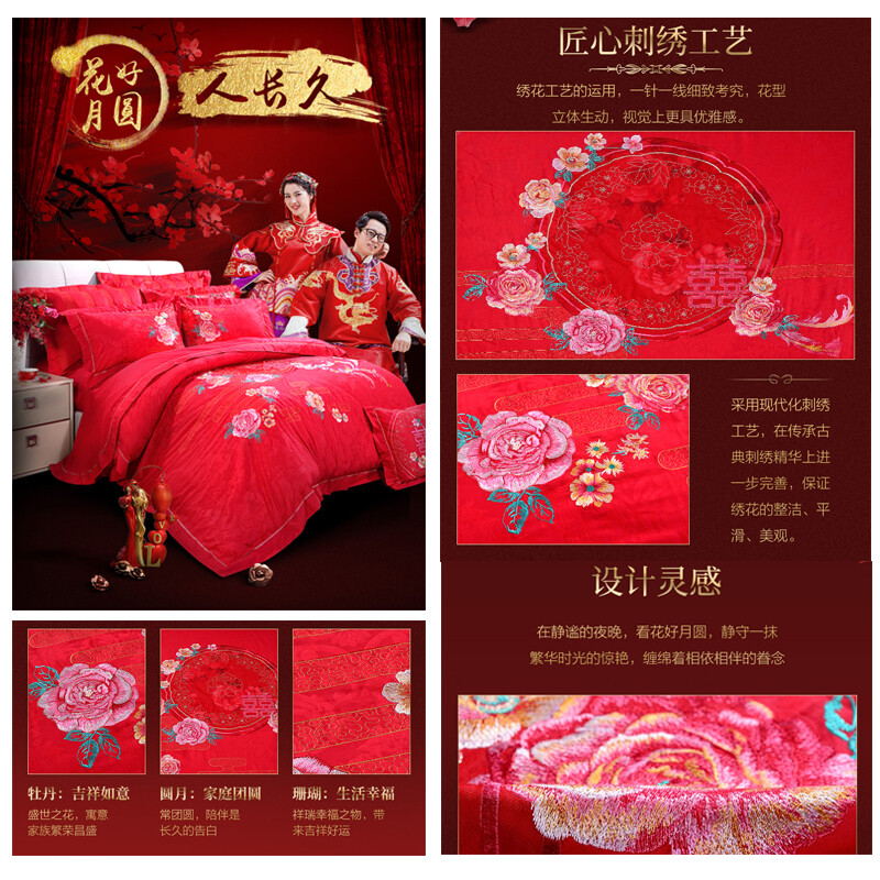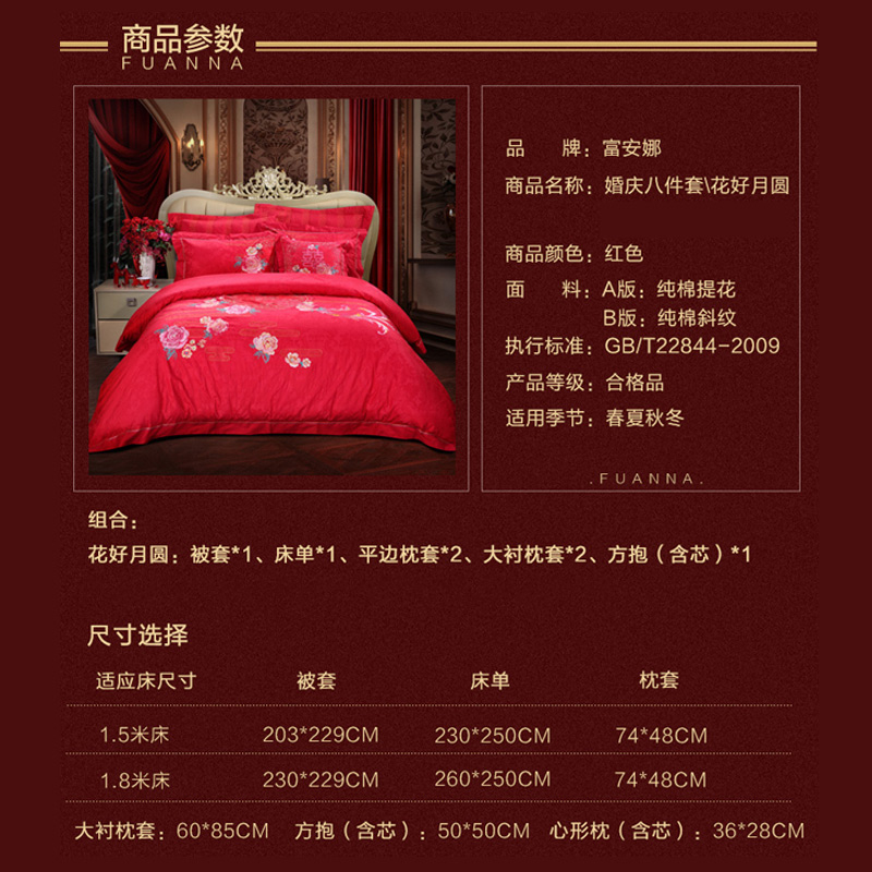 花好月圆 床单八件套(被套1件床单1件枕套4件方抱芯1件方抱套1件)(适合1.8米床)【纯棉提花/红】 |