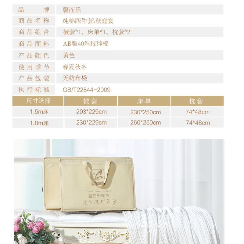 秋庭宴 床单四件套(被套1件床单1件枕套2件)(适合1.8米床)【面料:纯棉40支斜纹/黄】 |