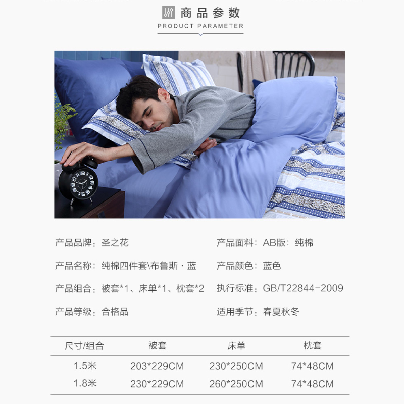 条纹 床单四件套(被套1件床单1件枕套2件)(适合1.8米床)【面料:纯棉40支斜纹/蓝】 |