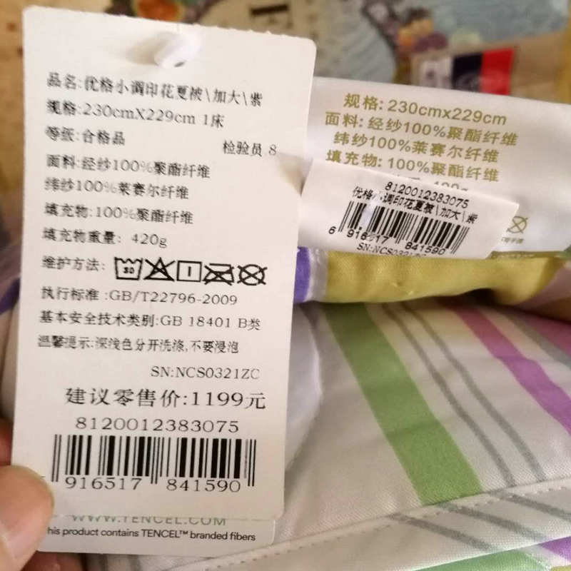 优格小调涤天丝印花夏被(夏被一件)(适合1.8米床)【面料:聚酯纤维+莱赛尔纤维;填充:聚酯纤维/紫】 |