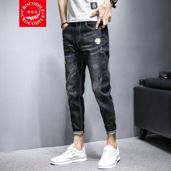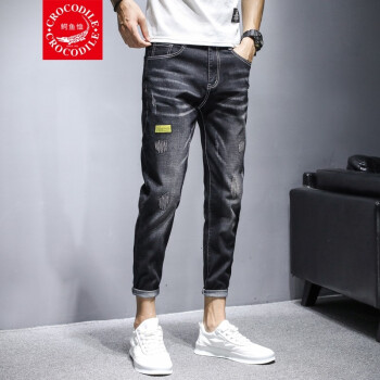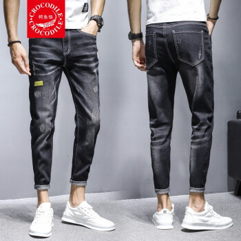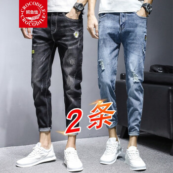 【两条装】鳄鱼恤牛仔裤男夏季新款裤子男韩版潮流小脚九分裤男士宽松休闲裤男时尚百搭破洞牛仔裤男修身男裤 981黑色+897蓝色 31 |