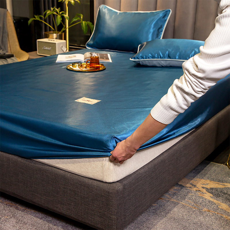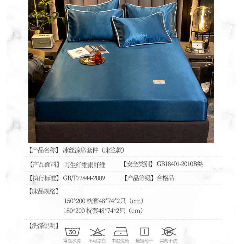 【柔软清爽 凉而不冰】无印床笠款冰丝席三件套【冰丝面料(聚酯纤维)/贵族-蓝】 |