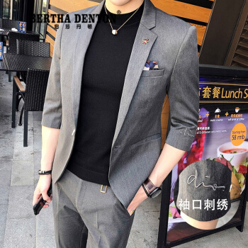 伯莎丹顿品牌夏季短袖痞帅小西装男外套2020新款修身垂感刺绣一套西服潮 中灰色【西装+西裤+黑色T恤】 XL |