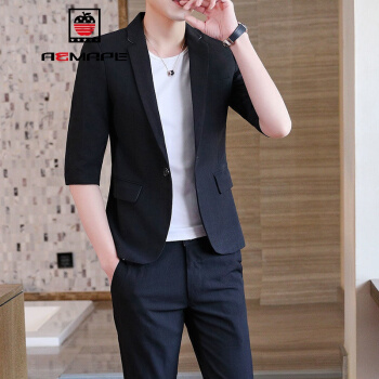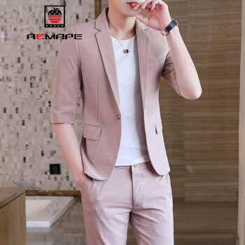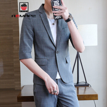 AEMAPE/美国苹果夏季西服套装男修身中袖小西装一套时尚休闲七分袖外套气质男装潮 926灰色套装(送T恤) XL 120-135斤 |