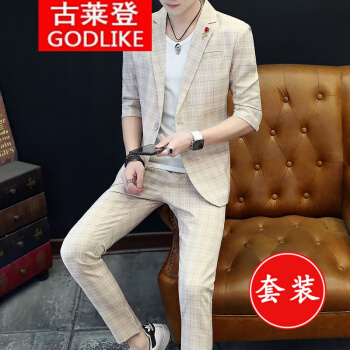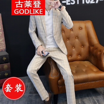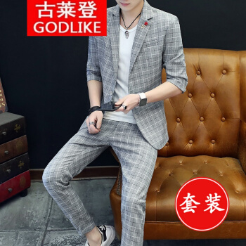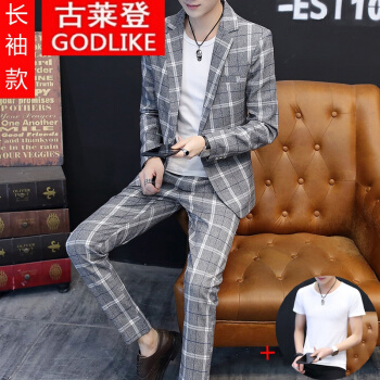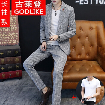 古莱登秋季男士格子休闲西装一套装韩版修身英伦风男外套小西服潮流帅气 6617长袖灰色套装+T恤 175/XL |