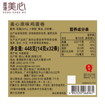 中国香港 美心(Meixin) 原味鸡蛋卷礼盒 团购大礼包福利送礼品 448g |